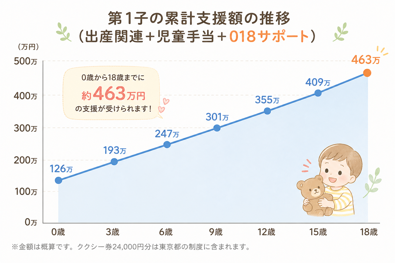 0歳から18歳まで、第1子1人で累計約463万円。これは出産関連の102万円に加えて、児童手当234万円(0〜18歳合計)、018サポート108万円、2歳バースデーサポート1万円、医療費助成は別途無料、を足した金額です。子どもの教育費・養育費の大きな下支えになる金額ですね。